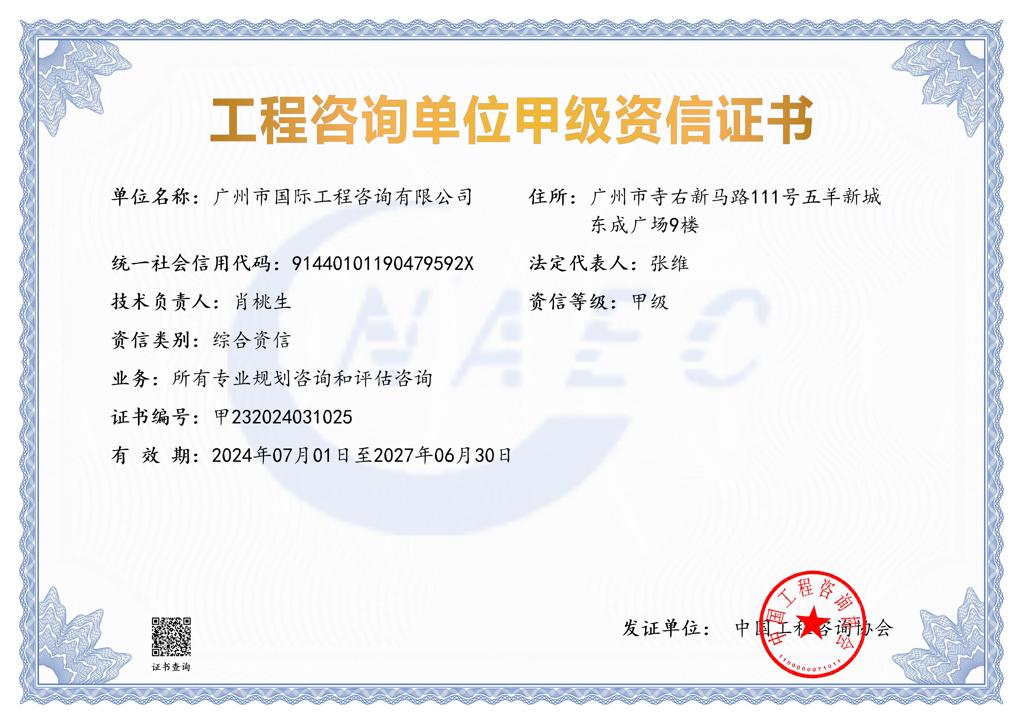 工程咨詢單位甲級資信證書(專業(yè)資信)