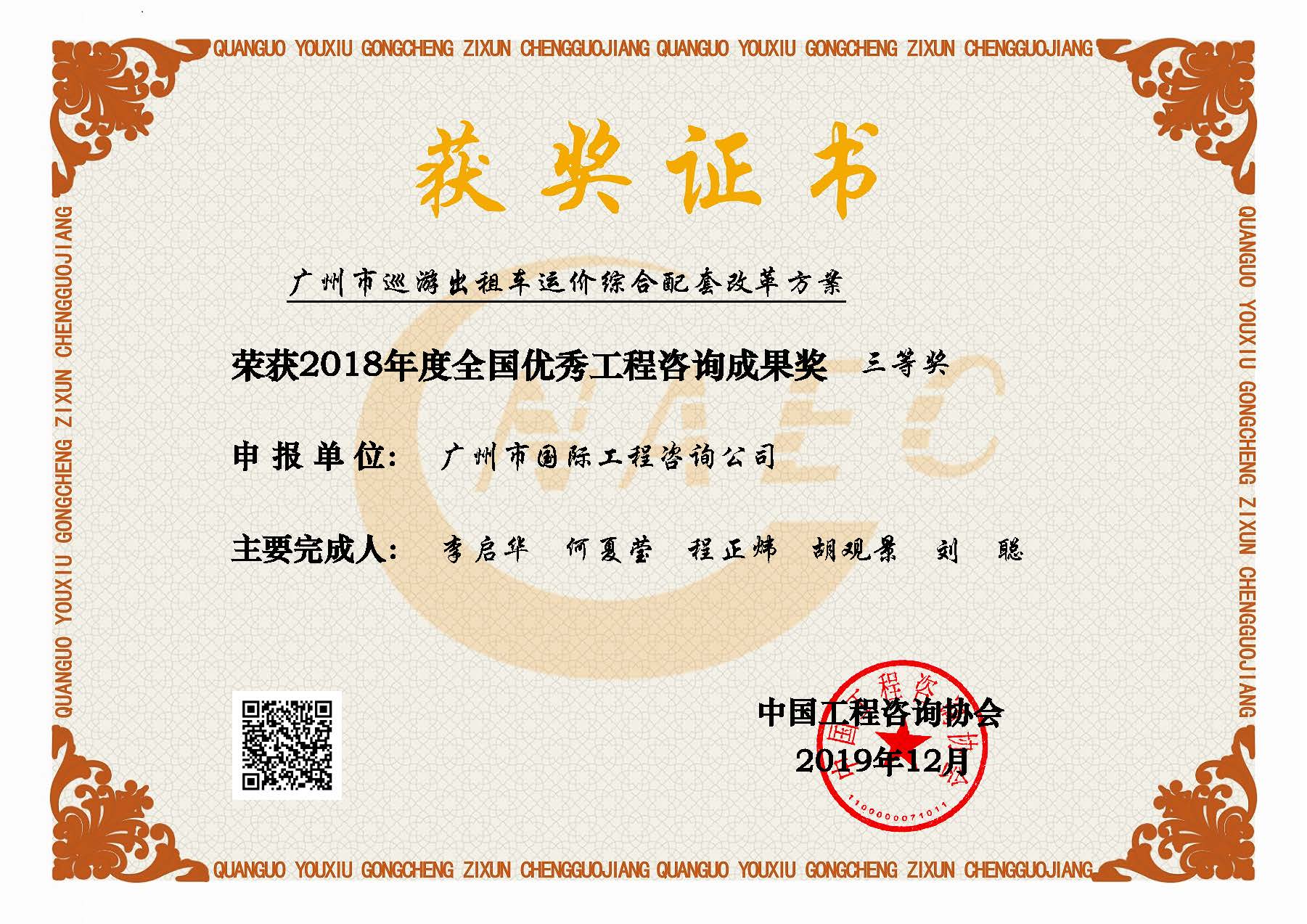 2018年度全國(guó)優(yōu)秀工程咨詢成果三等獎(jiǎng)(廣州市巡游出租車運(yùn)價(jià)...
