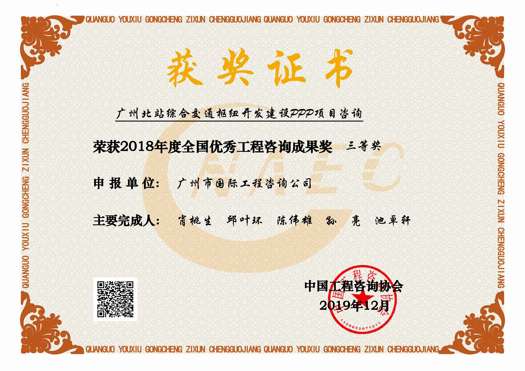 2018年度全國(guó)優(yōu)秀工程咨詢成果三等獎(jiǎng)(廣州北站綜合交通樞紐...