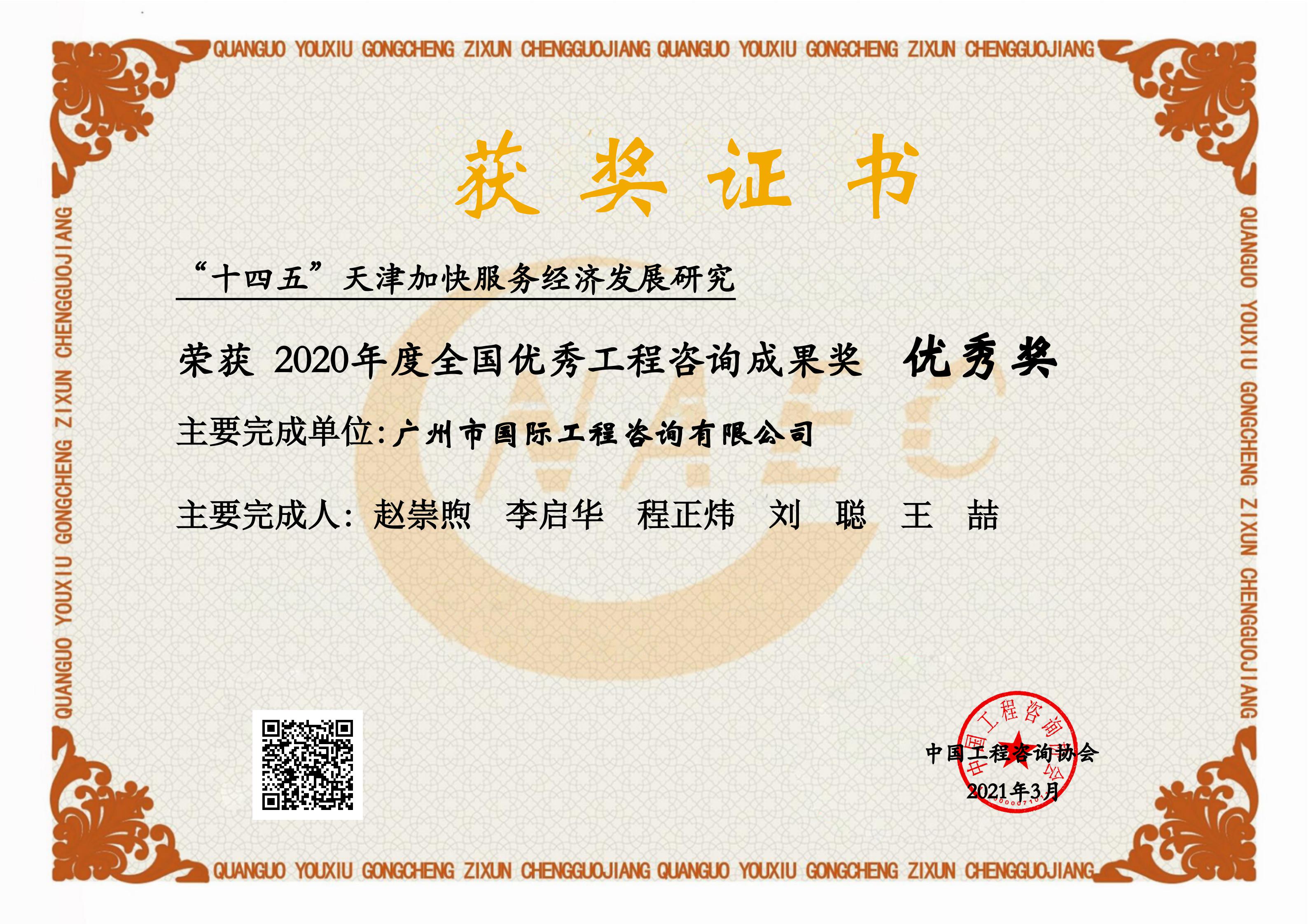 2020年度全國(guó)優(yōu)秀工程咨詢成果獎(jiǎng)優(yōu)秀獎(jiǎng)(“十四五”天津加快服...