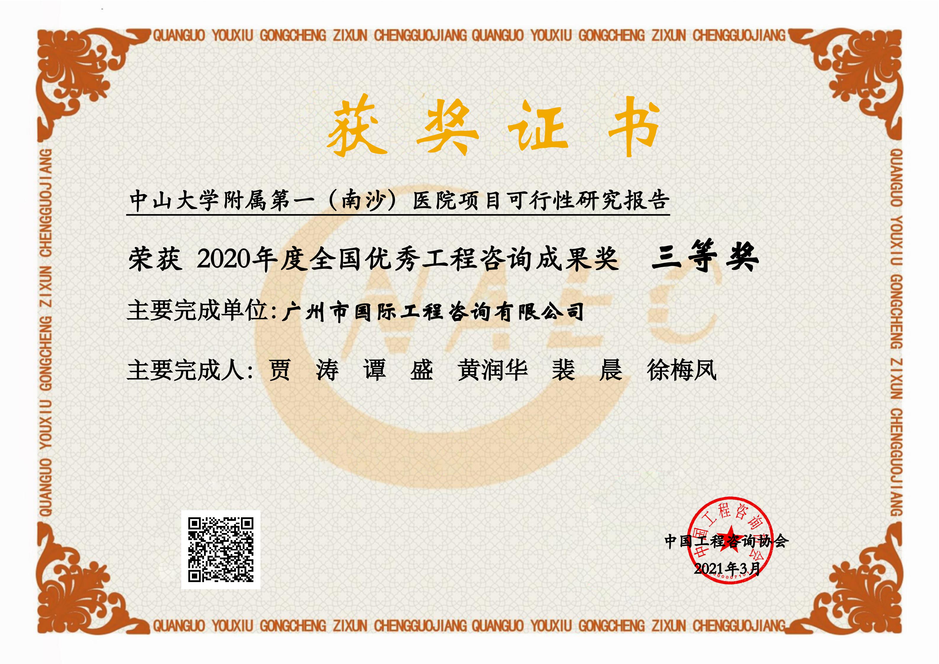 2020年度全國(guó)優(yōu)秀工程咨詢成果獎(jiǎng)三等獎(jiǎng)(中山大學(xué)附屬第一(南...