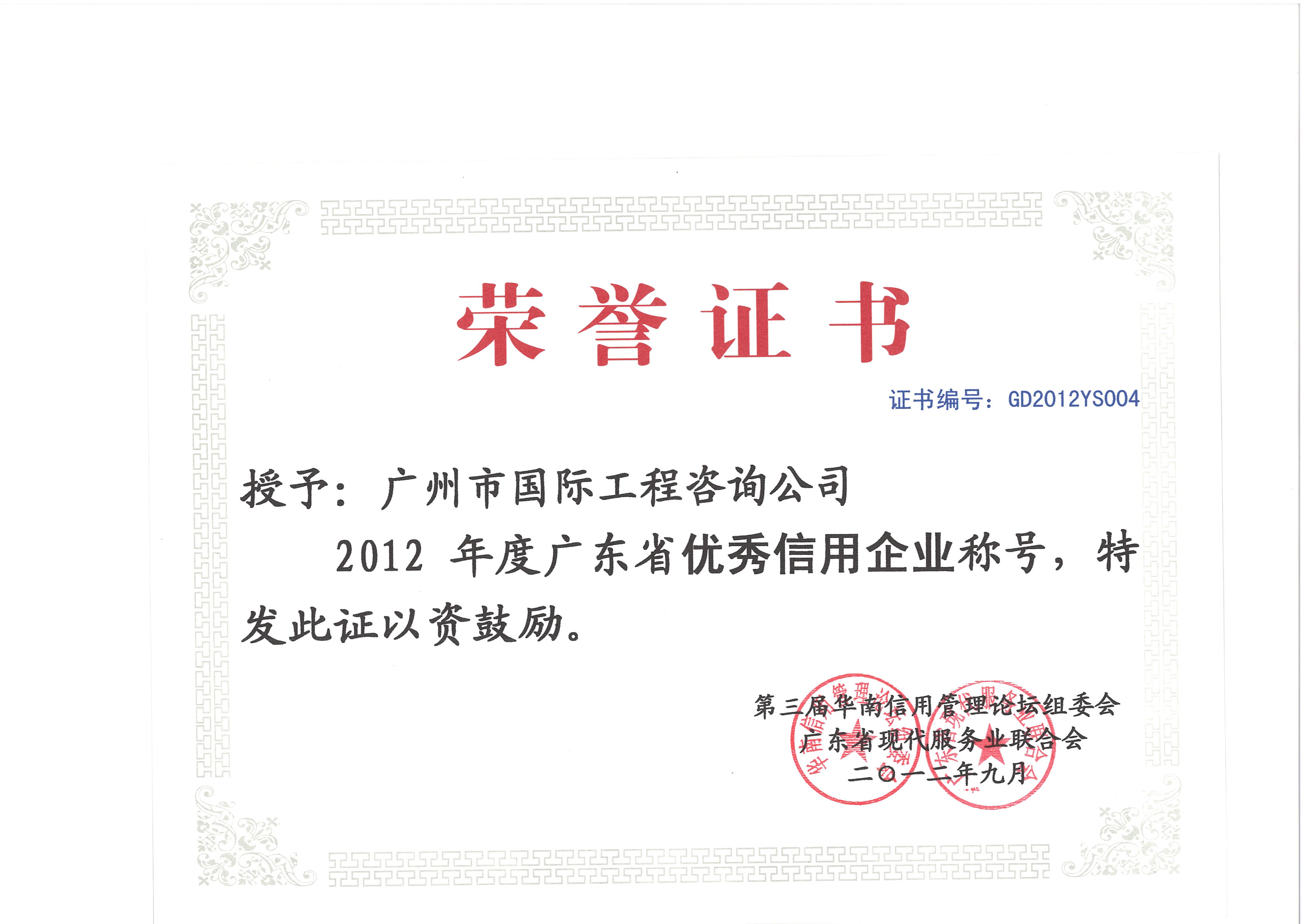 2012年度廣東省優(yōu)秀信用企業(yè)證書(shū)