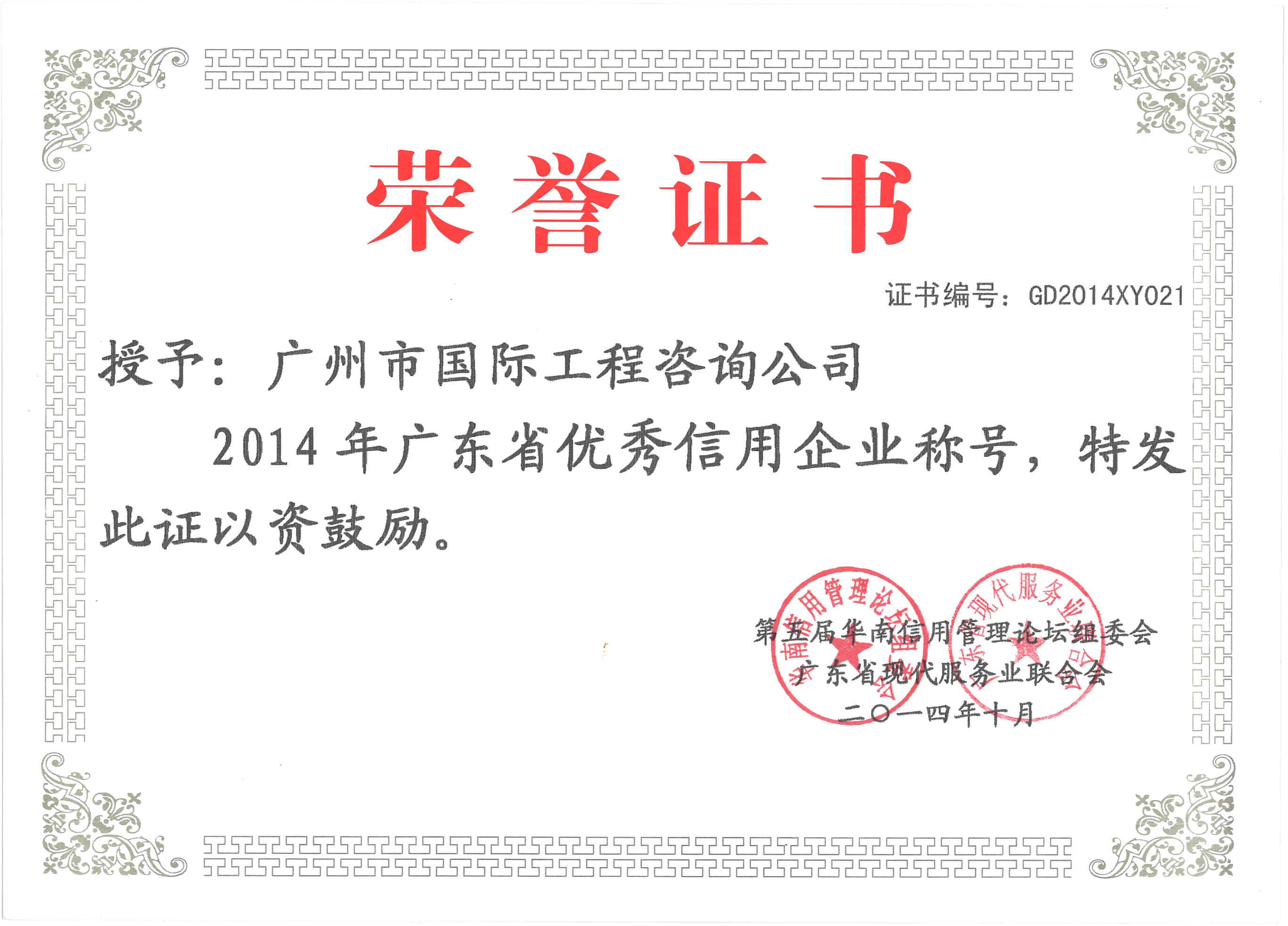 2014年廣東省優(yōu)秀信用企業(yè)