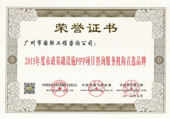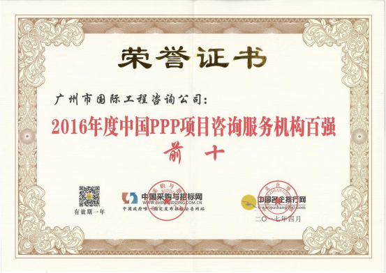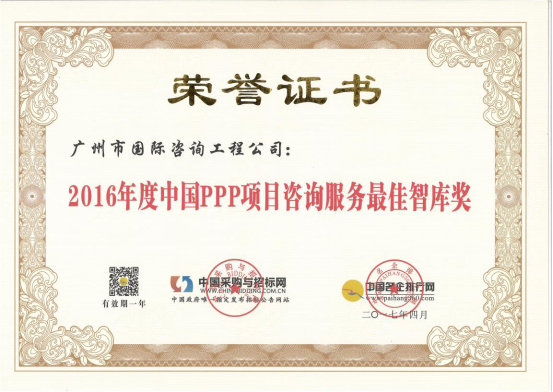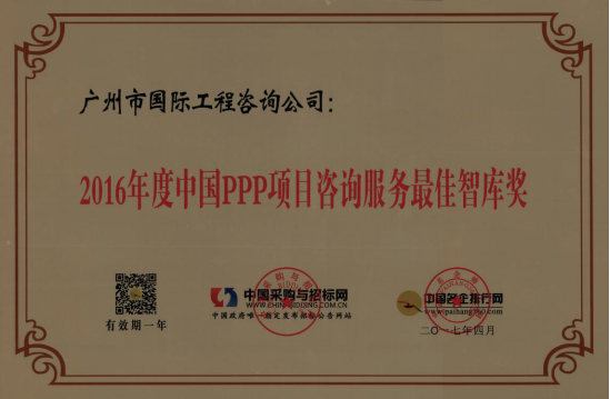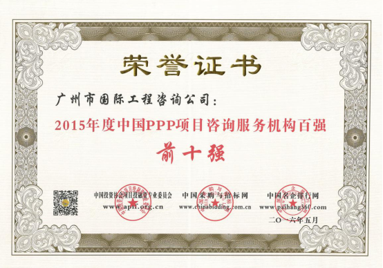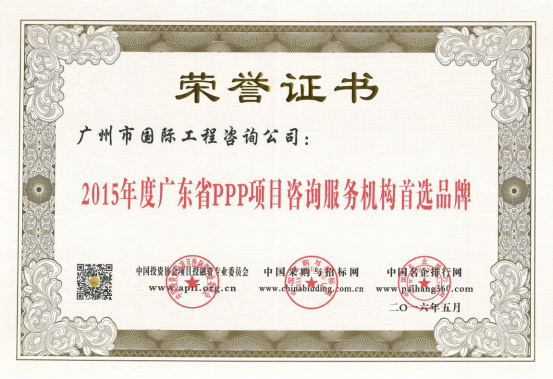 廣州市國(guó)際工程咨詢公司已連續(xù)兩年,蟬聯(lián)年度中國(guó)PPP項(xiàng)目咨詢服務(wù)機(jī)構(gòu)十大頂級(jí)品牌等獎(jiǎng)項(xiàng)。