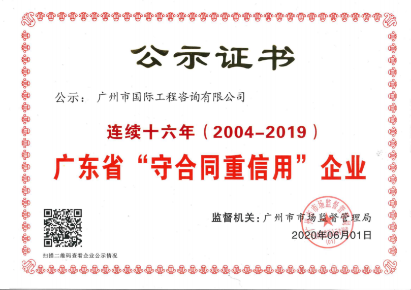 近日,廣州市國際工程咨詢有限公司順利通過廣東省市場監(jiān)督管理局與廣州市市場監(jiān)督管理局評審,榮獲“廣東省守合同重信用企業(yè)”稱號,這是自2004年以來,我司連續(xù)16年獲頒此殊榮,這也是我司多年守法經(jīng)營,深入推動誠信建設(shè)、堅(jiān)持誠信履約所取得的重要成果。