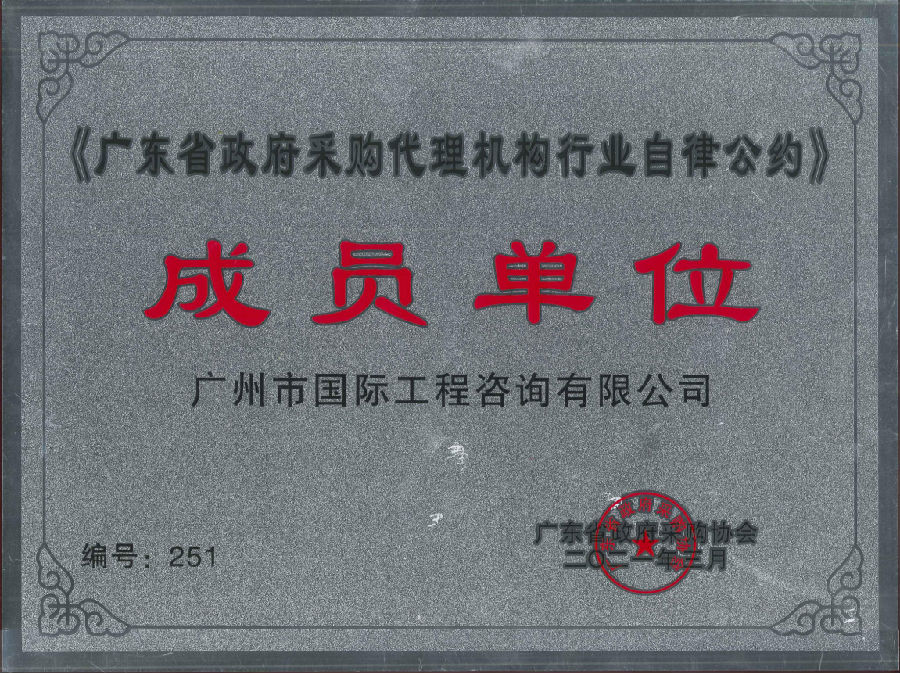 為建立和健全廣東省政府采購代理機(jī)構(gòu)行業(yè)自律機(jī)制,規(guī)范采購代理機(jī)構(gòu)從業(yè)行為,通過廣泛征求行業(yè)及會員意見,廣東省政府采購協(xié)會編制《廣東省政府采購代理機(jī)構(gòu)行業(yè)自律公約》。廣州市國際工程咨詢有限公司簽署公約承諾書并遵守執(zhí)行,共同維護(hù)市場秩序和政府采購行業(yè)的規(guī)范發(fā)展,于近期被授予《廣東省政府采購協(xié)會代理機(jī)構(gòu)行業(yè)自律公約》成員單位以示鼓勵。