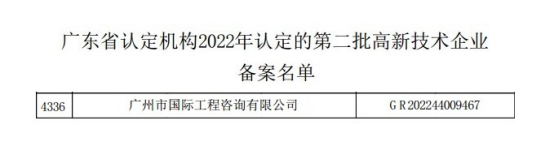 近日,全國(guó)高新技術(shù)企業(yè)認(rèn)定管理工作領(lǐng)導(dǎo)小組辦公室發(fā)布了《關(guān)于對(duì)廣東省認(rèn)定機(jī)構(gòu)2022年認(rèn)定的第二批高新技術(shù)企業(yè)進(jìn)行備案的公告》,廣州市國(guó)際工程咨詢有限公司(以下簡(jiǎn)稱“廣州國(guó)際咨詢公司”)被成功認(rèn)定為國(guó)家高新技術(shù)企業(yè)。