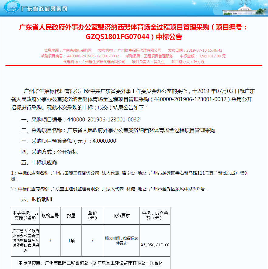 7月10日,廣州市國際工程咨詢公司及廣東重工建設(shè)監(jiān)理有限公司聯(lián)合體成功中標(biāo)廣東省人民政府外事辦公室斐濟(jì)納西努體育場全過程項(xiàng)目管理采購,為我司增添了一項(xiàng)重要的全過程項(xiàng)目管理服務(wù)業(yè)績。
