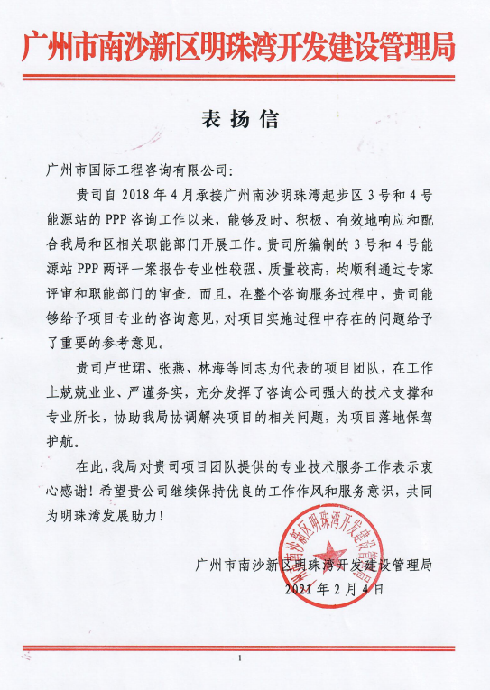 廣州市國際工程咨詢有限公司(下稱“廣州國際咨詢公司”)自2018年4月承接3號(hào)和4號(hào)能源站的PPP咨詢工作以來,歷時(shí)近3年時(shí)間,在項(xiàng)目邊界數(shù)次變更的情況下,及時(shí)、積極、有效地響應(yīng)和配合業(yè)主單位和區(qū)相關(guān)職能部門開展工作。在整個(gè)咨詢服務(wù)過程中,廣州國際咨詢公司給予項(xiàng)目專業(yè)的咨詢意見,并就項(xiàng)目實(shí)施PPP模式的前期條件和必要的研究工作給予了重要的參考意見,對(duì)PPP項(xiàng)目的順利實(shí)施落地起到了承上啟下的關(guān)鍵作用。項(xiàng)目團(tuán)隊(duì)在工作上兢兢業(yè)業(yè)、嚴(yán)謹(jǐn)務(wù)實(shí),充分發(fā)揮了廣州國際咨詢公司強(qiáng)大的技術(shù)支撐和專業(yè)所長(zhǎng),協(xié)助業(yè)主單位協(xié)調(diào)解決項(xiàng)目問題,為項(xiàng)目落地保駕護(hù)航。